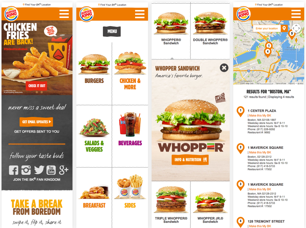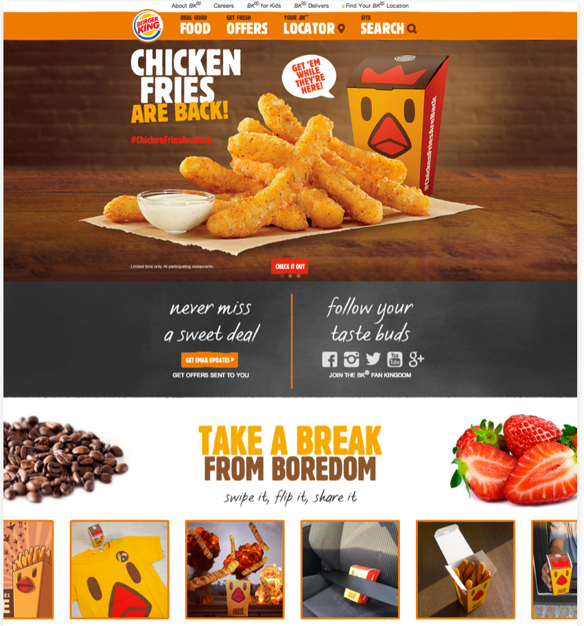The hero area allows for fresh content that’s updated with ease in the new CMS. Visitors can dig into the food, find a location, and explore new offers. The biggest addition is the inclusion of real-time social feeds via various social media platform API.