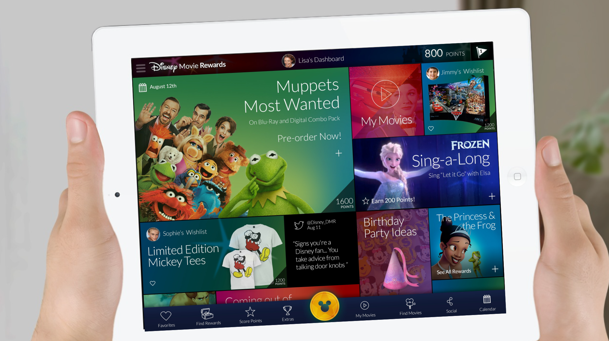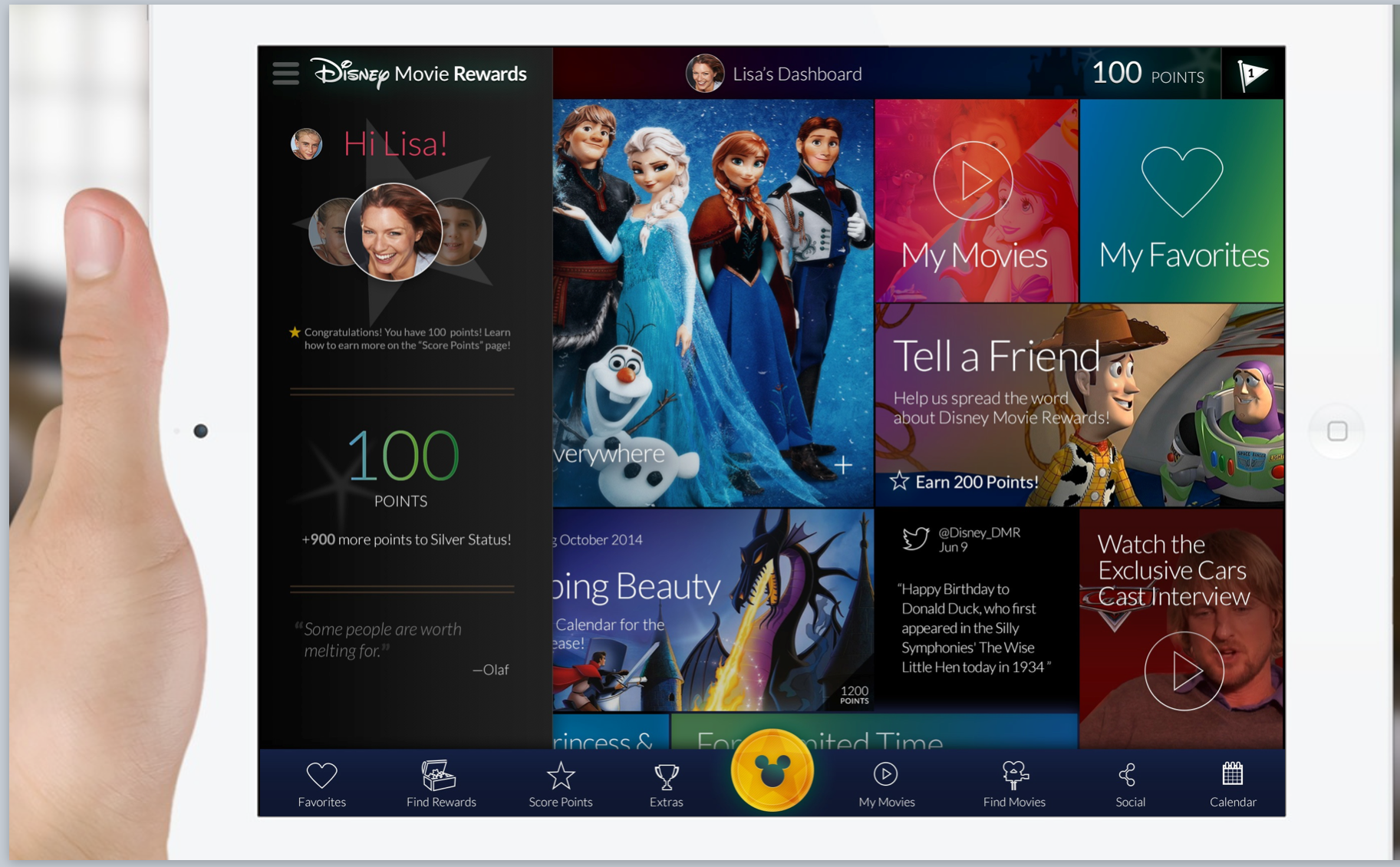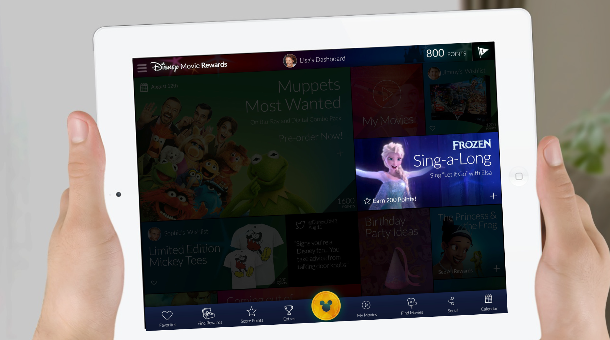 Here’s an example of just some of the ways our Customer Relationship Managment app can improve the lives of Disney fanatics. Our mom, Lisa, grabs her iPad to start her journey, tapping the Disney Movie Rewards icon.