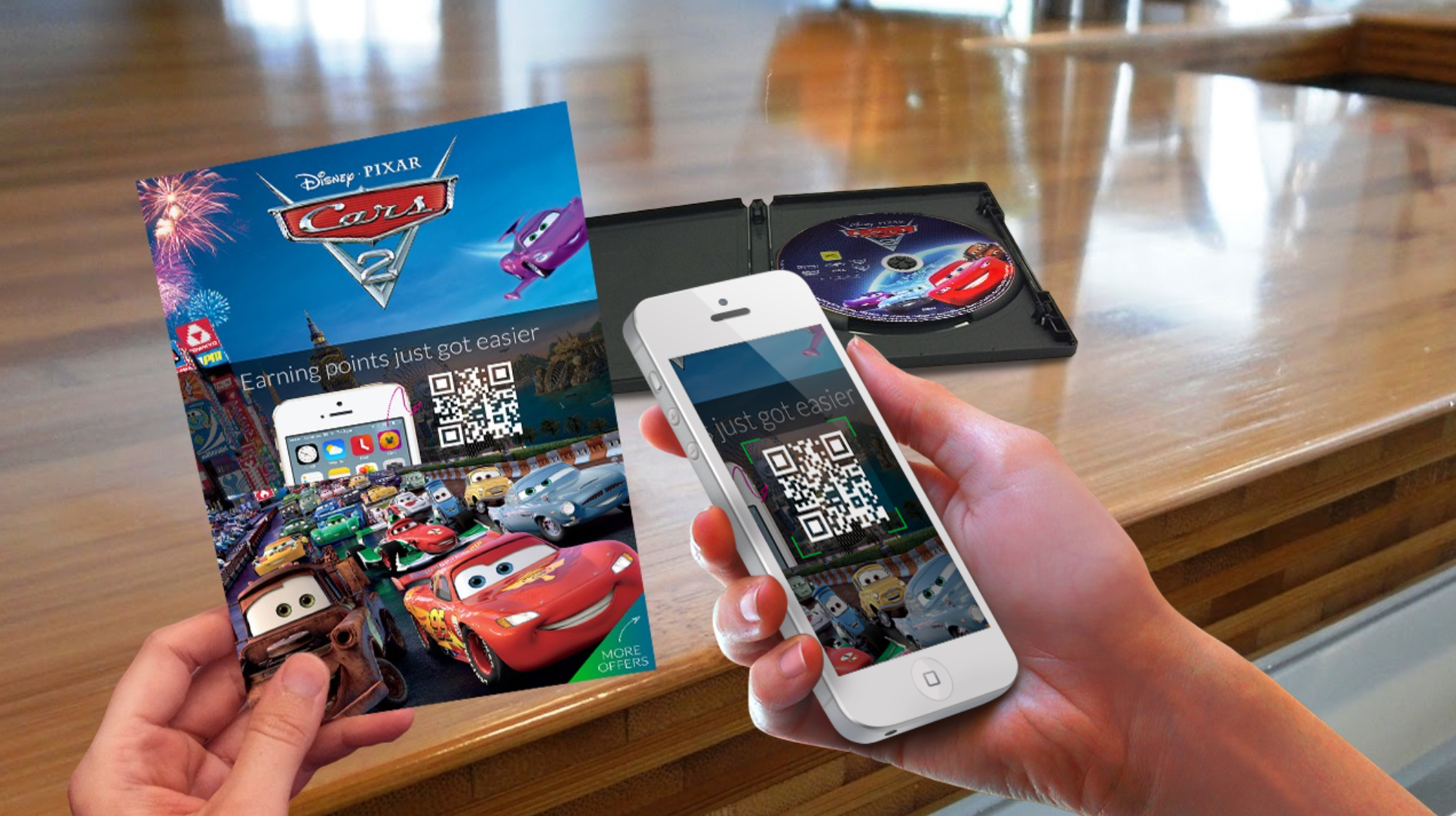 Once back at home, Lisa uses her app to scan the code inside the movie she’s just bought to receive credit for her purchase.