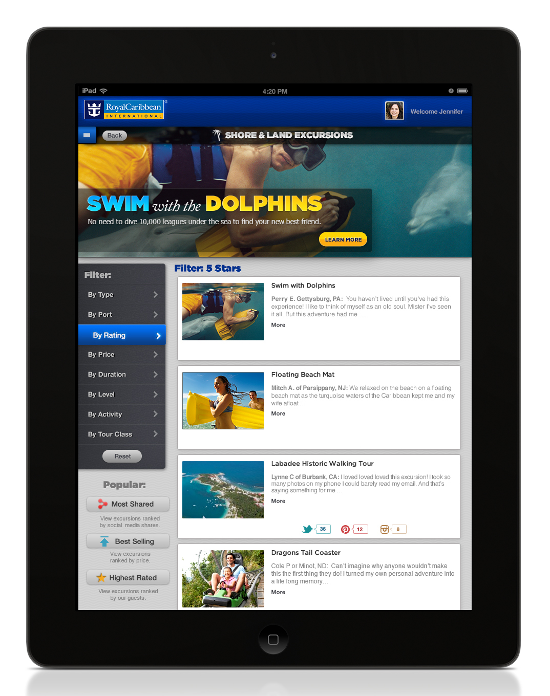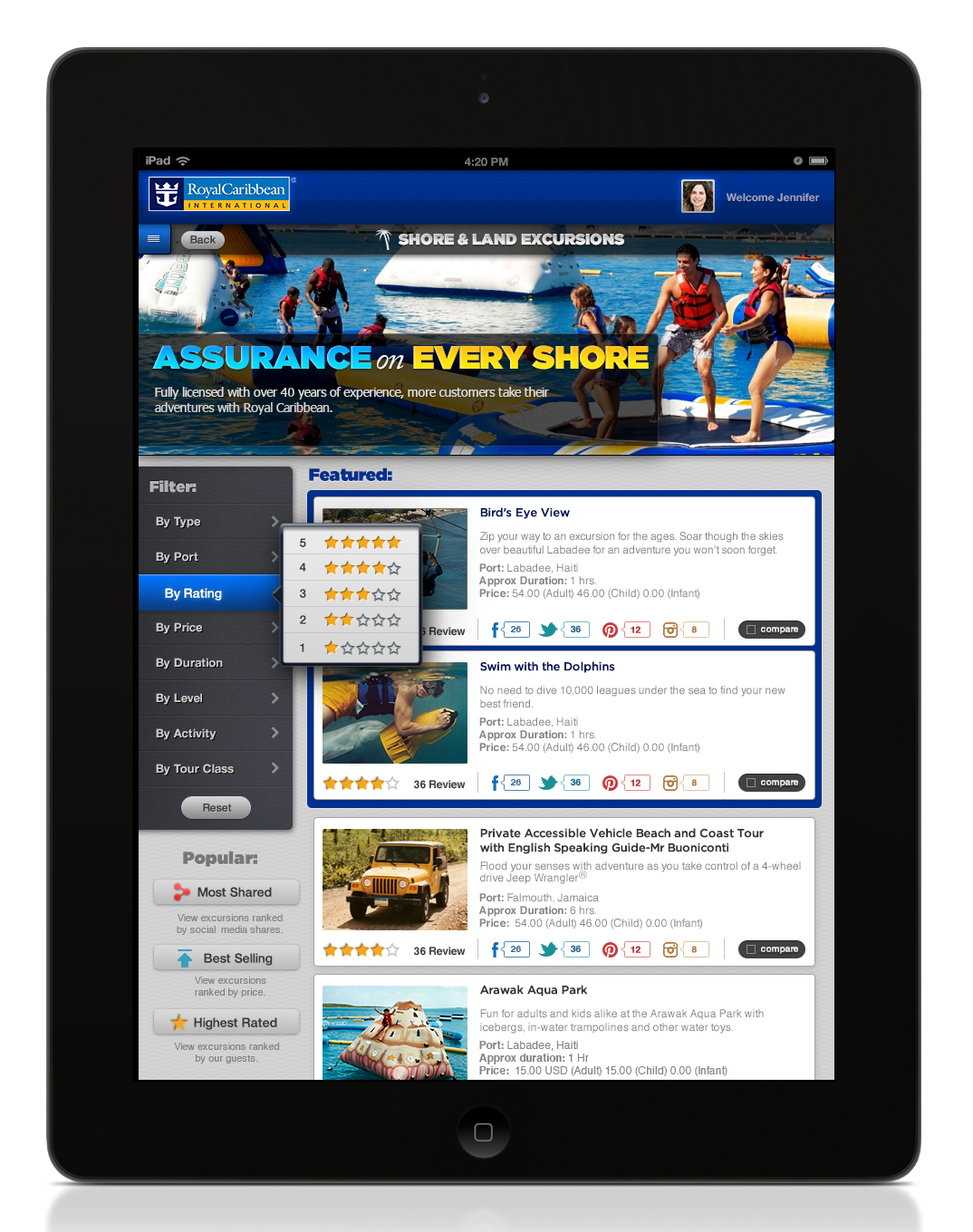 Filtering is easy to use. You can filter by date, excursion type, cost, or length of event. Here, we filter by rating. You’ve also got access to customer reviews across a number of social platforms.