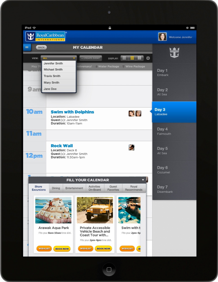 From the calendar you can further explore other offerings via the calendaring bar at the bottom or the filters at the top. You can access the calendars of those in your party and invite them to join or book for them.
