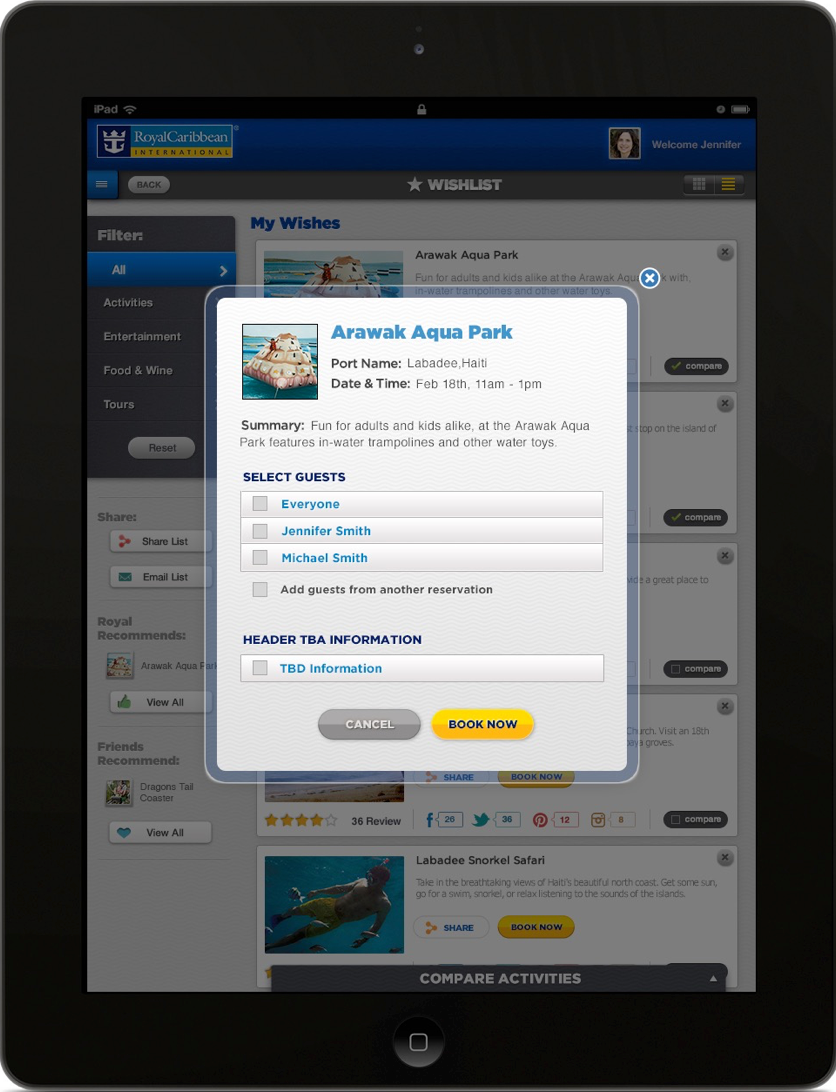 The details are pre-populated the information on the booking overlay. Select those in your party who you’d like to bring along and tap ‘Book Now.’